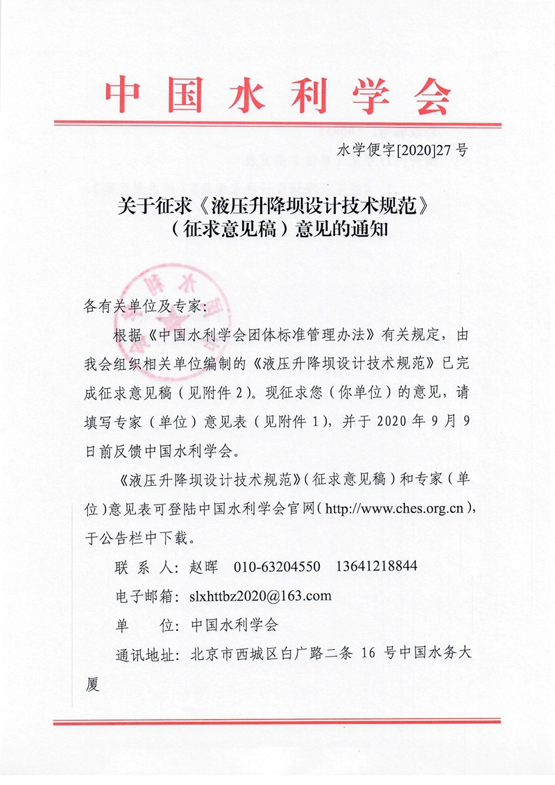 关于征求《液压升降坝设计技术规范》(征求意见稿)意见的通知