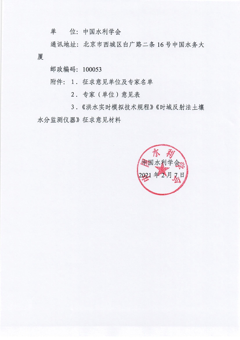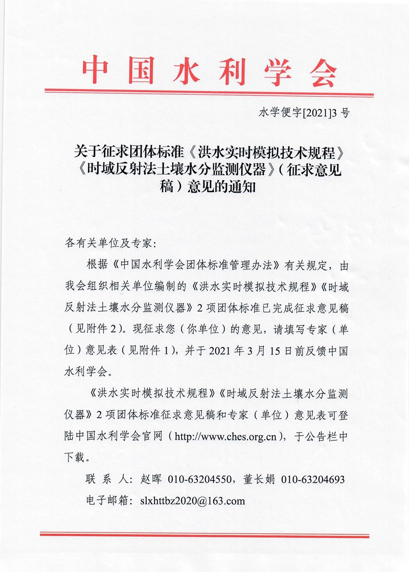 关于征求团体标准《洪水实时模拟技术规程》《时域反射法土壤水分监测仪器》(征求意见稿)意见的通知