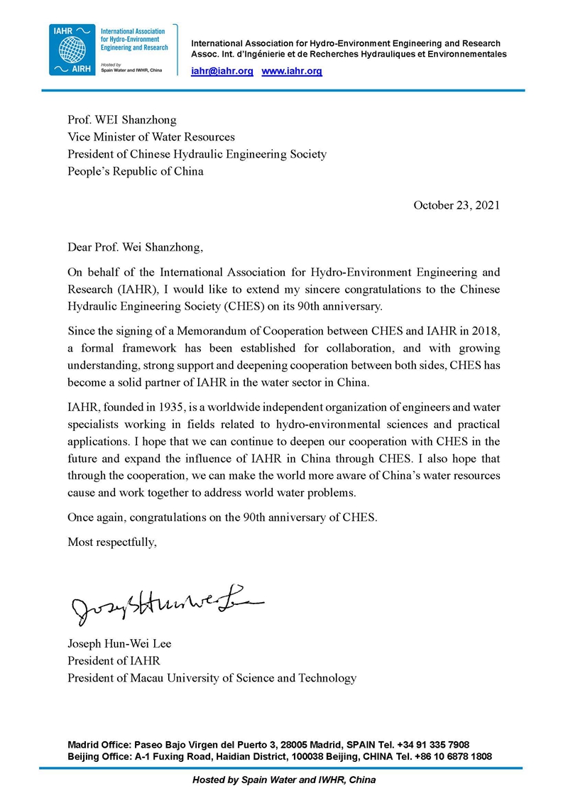 我谨代表国际水利与环境工程学会(IAHR),对中国水利学会成立90周年表示诚挚的祝贺。