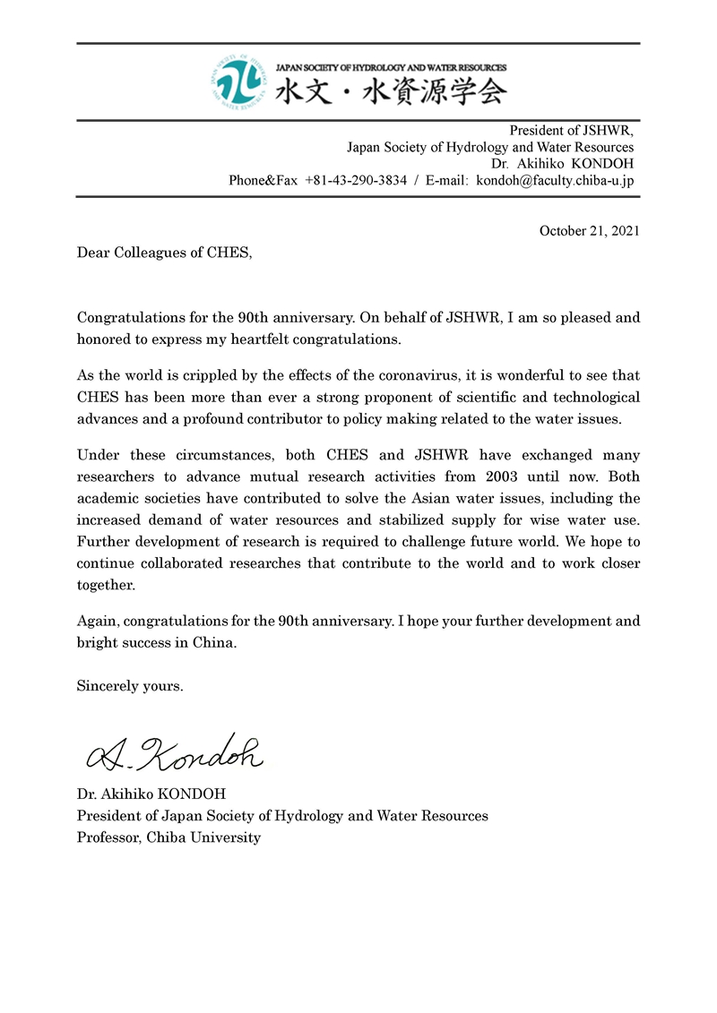 我谨代表日本水文水资源学会(JSHWR),对CHES 90周年表示由衷的祝贺。