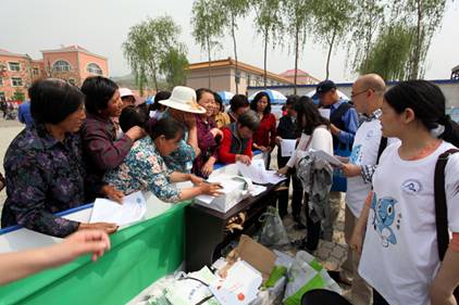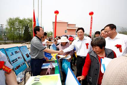 北京市水土保持工作总站副主任袁爱萍带领十五名专业的水利工程师和二十八块展板在现场宣传水保知识,办公室主任刘祥忠同志一到展台就被乡亲们围住了,聚拢在他的身边讨要水土保持法手册,并讨教水土保持的经验体会。