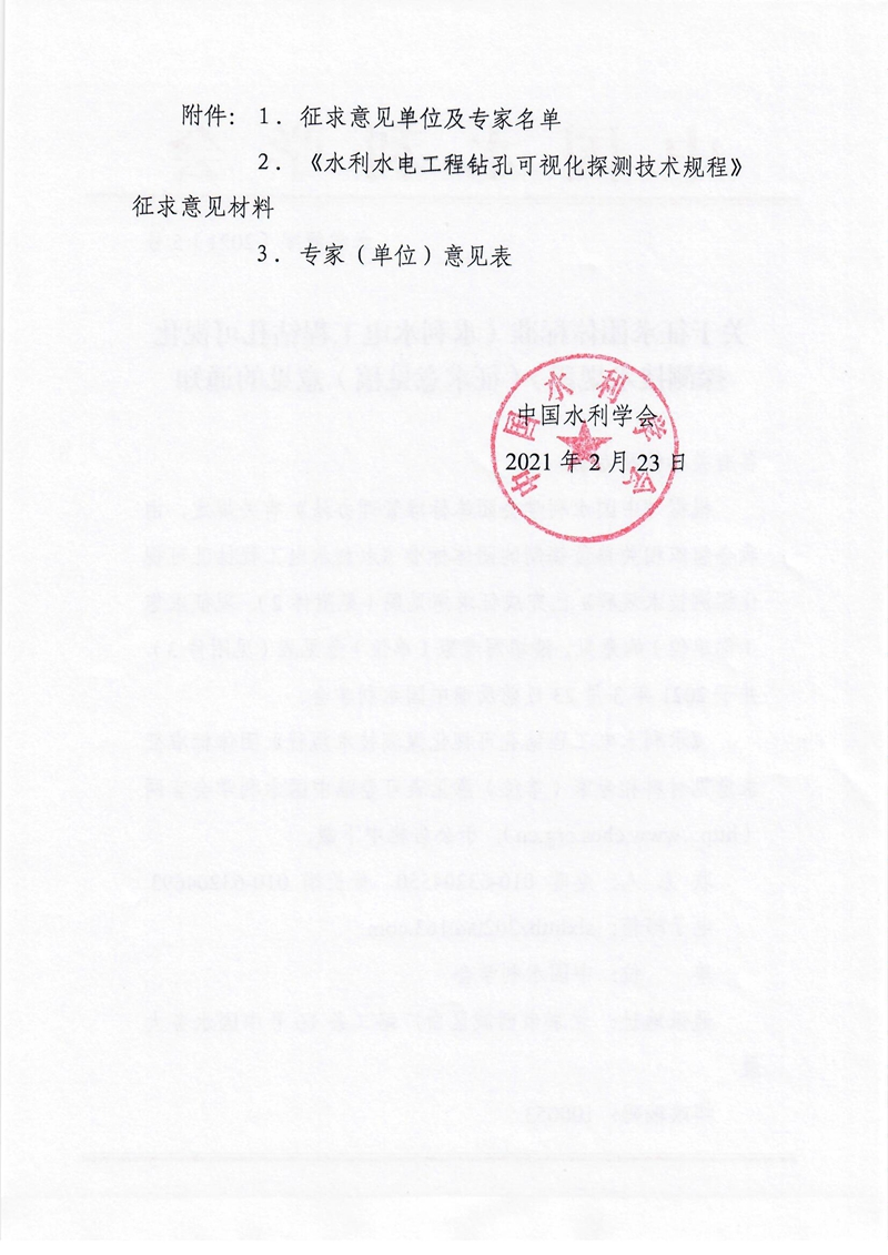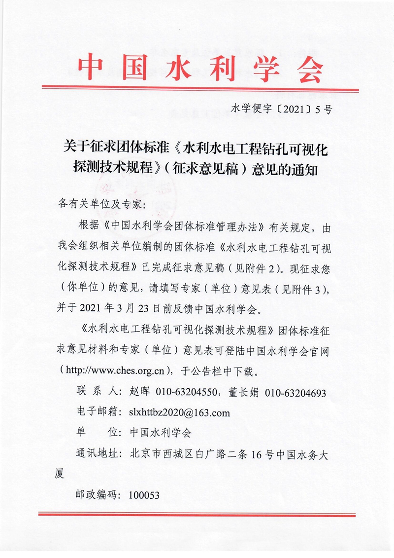 关于征求团体标准《水利水电工程钻孔可视化探测技术规程》(征求意见稿)意见的通知